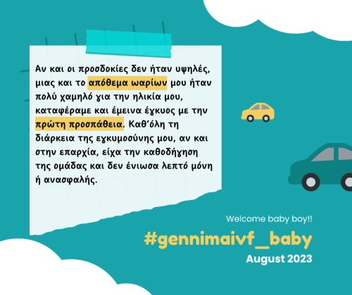 Αν και οι προσδοκίες δεν ήταν υψηλές, μιας και το απόθεμα ωαρίων μου ήταν πολύ χαμηλό για την ηλικία μου, καταφέραμε και έμεινα έγκυος με την πρώτη προσπάθεια. Καθ’όλη τη διάρκεια της εγκυμοσύνης μου, αν και στην επαρχία, είχα την καθοδήγηση της ομάδας και δεν ένιωσα λεπτό μόνη ή ανασφαλής.