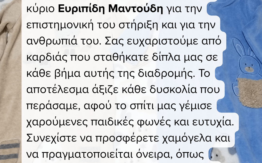 Ευχαριστούμε ιδιαιτέρως τον γιατρό κύριο Ευριπίδη Μαντούδη για την επιστημονική του στήριξη και για την ανθρωπιά του. Σας ευχαριστούμε από καρδιάς που σταθήκατε δίπλα μας σε κάθε βήμα αυτής της διαδρομής. Το αποτέλεσμα άξιζε κάθε δυσκολία που περάσαμε, αφού το σπίτι μας γέμισε χαρούμενες παιδικές φωνές και ευτυχία.